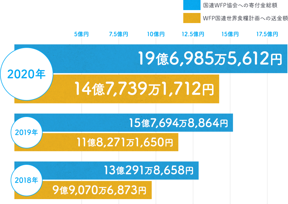 2020年に企業・団体および個人の皆さまから国連WFP協会へ寄せられたご寄付は、合計で19億6,985万5,612円となりました。