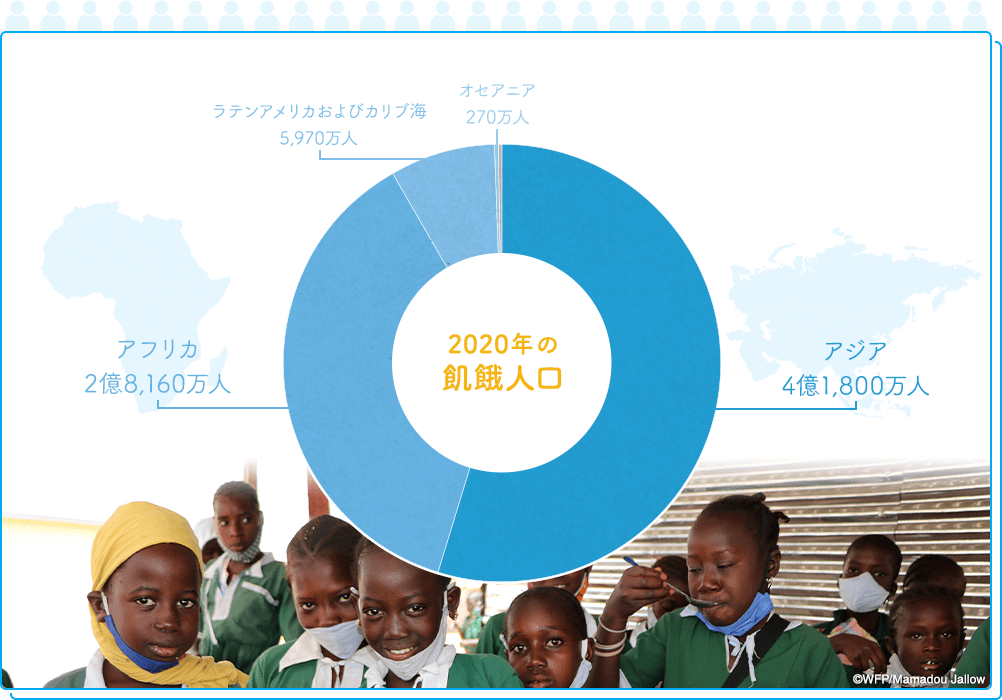 ※地域別の数値は2020年の飢餓人口7億2000万人~最大8億1100万人の、中間値7億6800万人をもとに算出しています。