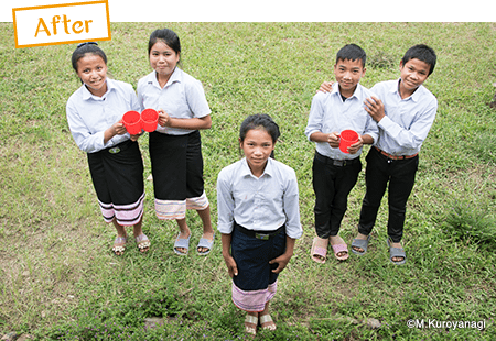 2011年、当時8歳だったラオスのパンちゃん(写真中央)は、国語が大好きで、給食を食べて元気に学校に通っていました。