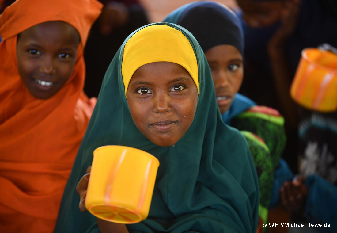 ソマリ州の難民キャンプで給食を食べるネスラちゃん(12歳)。国連WFPは子どもたちに栄養を強化した温かいお粥を毎日提供することで、ビタミンA、鉄分、亜鉛などの欠乏による「微量栄養素欠乏症」を克服できるように支えています。